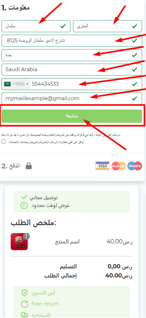 4- قم بملئ بياناتك بالكامل مثل الاسم والعنوان ورقم الهاتف والبريد الالكتروني ليتم ارسال المنتج الى باب المنزل
